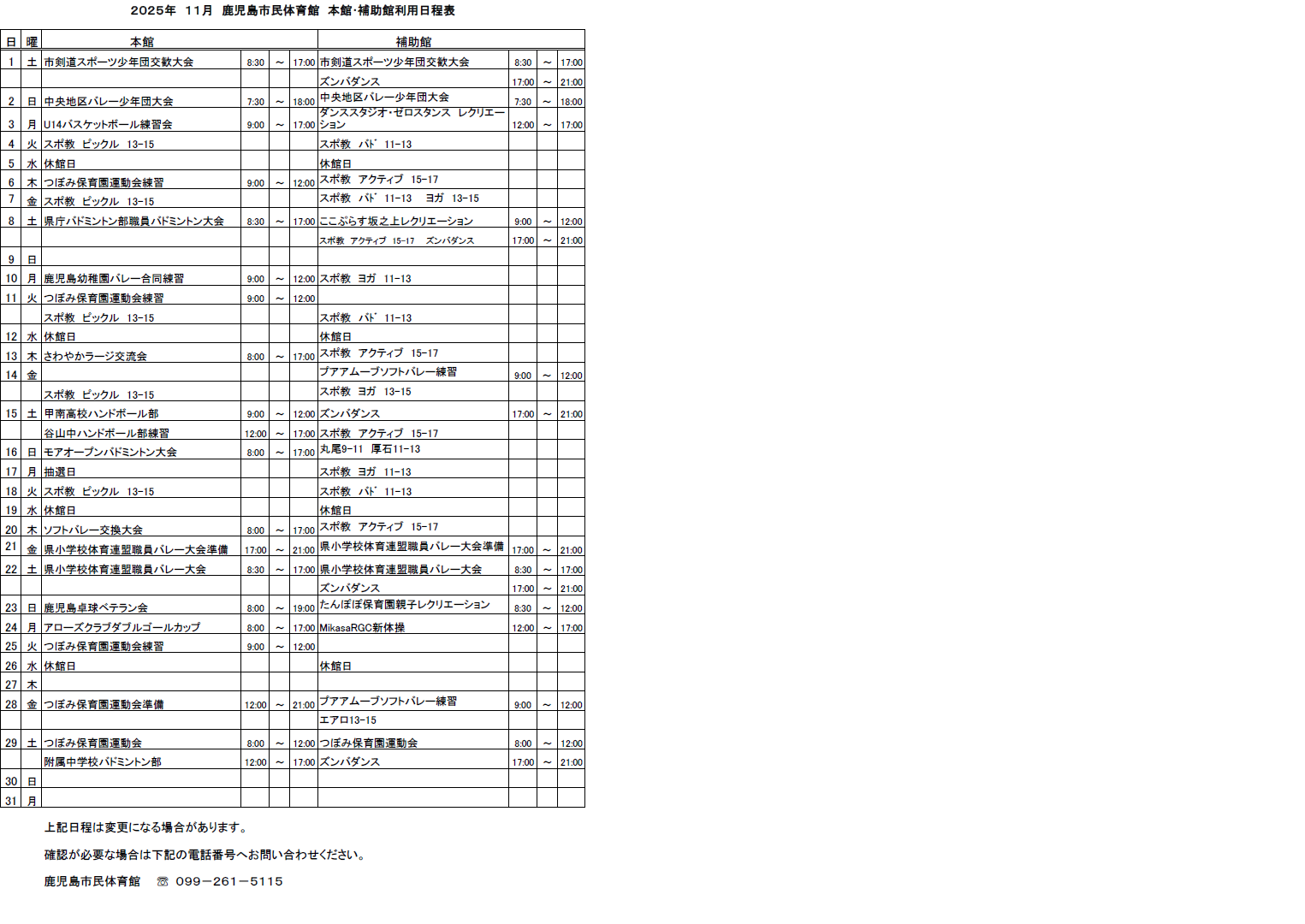 - 令和7年11月 利用日程表・専用使用許可申請書・打ち合わせ表・専用仮予約申込書・グランドゴルフ用具借用申請書等をダウンロードできます。