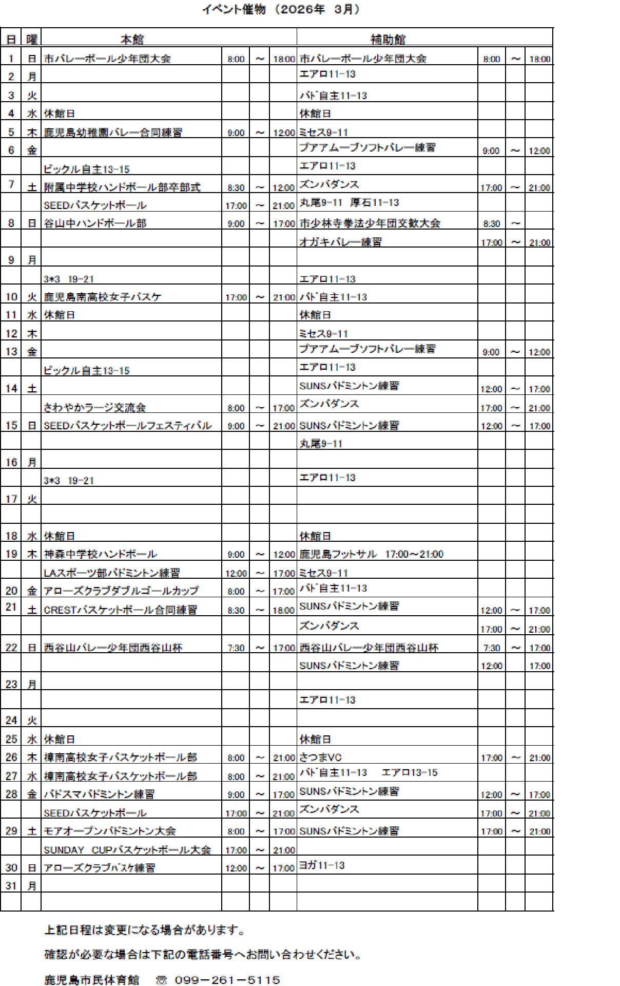 2025年度3月~ 市民体育館利用日程表
