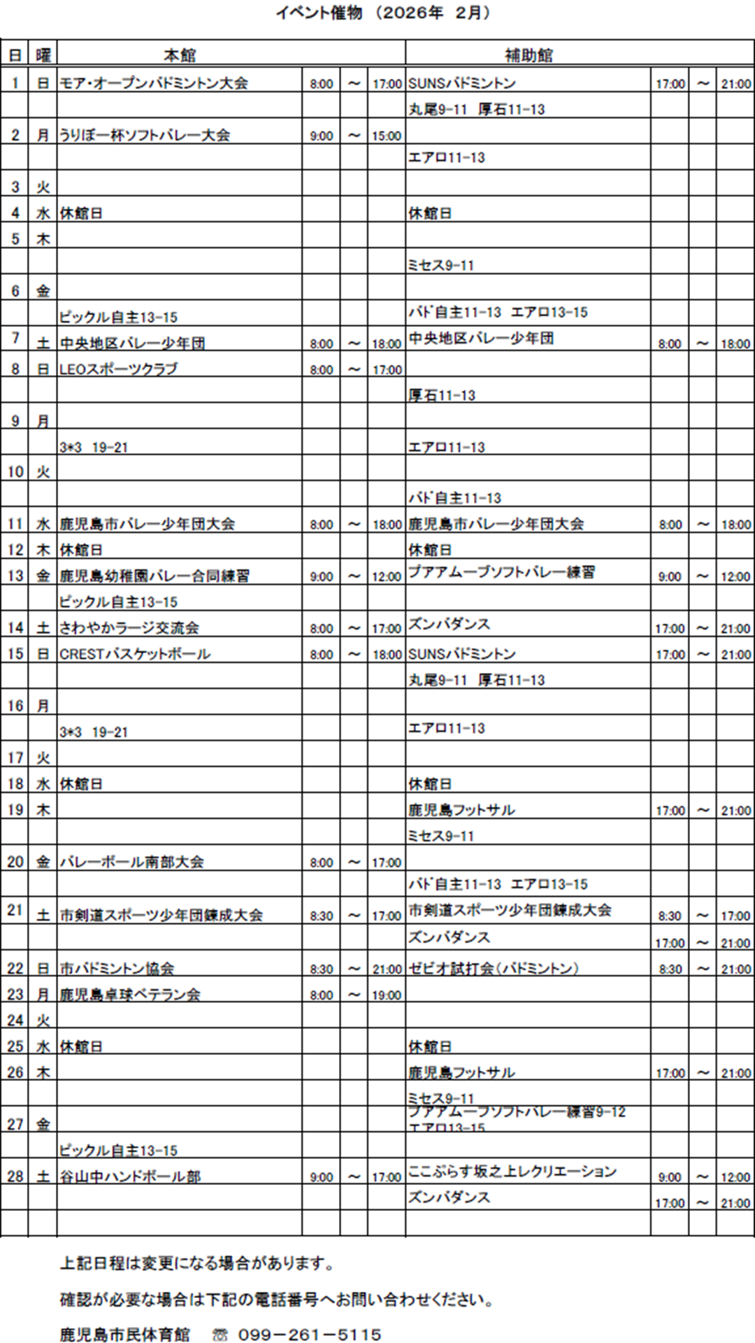 2025年度2月~ 市民体育館利用日程表