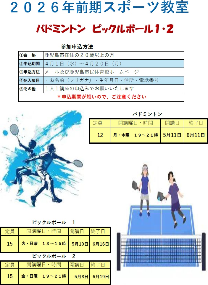 2026年度前期スポーツ教室を 下記の3教室で開催いたします。